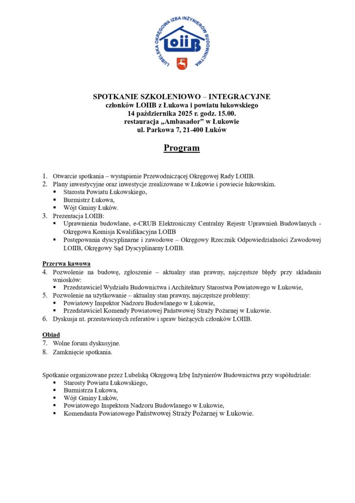 Lubelska Okręgowa Izba Inżynierów Budownictwa serdecznie zaprasza członków LOIIB z Łukowa i powiatu łukowskiego na spotkanie szkoleniowo-integracyjne, które odbędzie się 14 października 2025 roku o godzinie 15.00 w restauracji „Ambasador” (ul. Parkowa 7, Łuków).